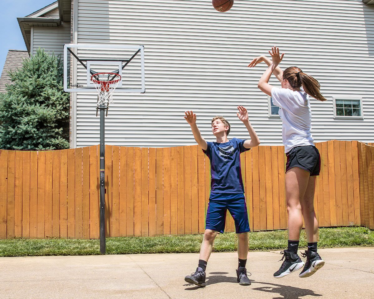 The Goaliath GoTek Basketball Hoop features a powder-coated steel pole and a revolutionary installation design. Using Stabili-Strength Technology, the GoTek directly installs the pole into the ground and secures with concrete inside the pole for increased stability and ultimate strength. The 54" W x 33" H Infinity Edge backboard has edges that wrap around to the back of the backboard as one continuous material for increased rigidity. The GoTek's Quick-Play design makes assembly as quick and easy as possible. The basketball hoop comes partially assembled with attached hardware and a pro-style breakaway rim allowing you to assemble your goal in less time than competitors. The spring-activated rim flexes under pressure, similar to professional-style rims. The breakaway rim also protects the backboard and prevents player injuries. Using an all-steel crank actuator, the basketball hoop is adjusted from the NBA and NCAA regulation rim height of 10 feet to the safety-approved 7.5 feet. This Go Tek basketball goal is backed by a 5-year limited warranty. Basketball accessories such as a basketball or basketball pole pad are not included .