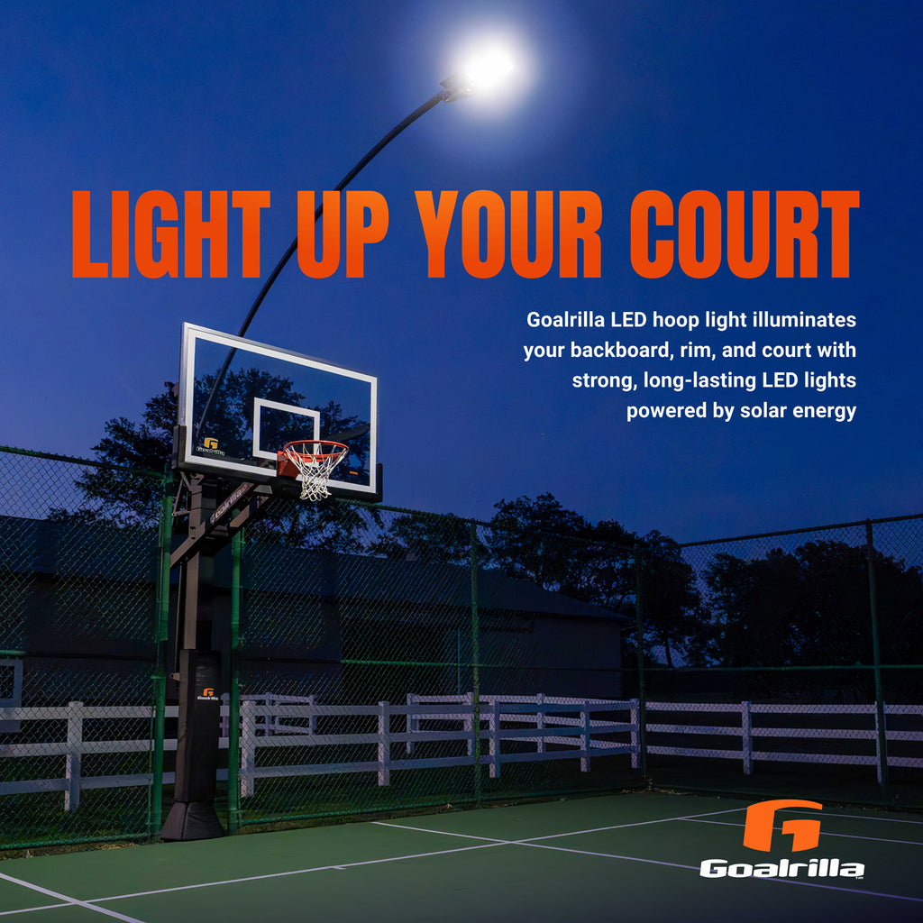 - LIGHT UP YOUR COURT – Goalrilla LED hoop light illuminates your backboard, rim, and court with strong, long-lasting LED lights powered by solar energy to help maximize practice time; no extension cords required